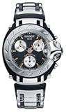 | Stainless steel and black resin case with a stainless steel and black resin bracelet. Fixed stainless steel bezel. Black dial with luminous skeletal hands and stick hour markers. Minutes markers. Tachymeter scale around the outer rim. Luminiscent hands and dial markers. Date display at the 3 o'clock position. Chronograph - three sub-dials displaying: 60 seconds, 30 minutes and 1/10th of a minute. Swiss quartz movement. Scratch resistant sapphire crystal. Case diameter: 40 mm. Case thickness: 12 mm. Push button deployment clasp. Water resistant at 100 meters / 330 feet. Functions: hours, minutes, seconds, date, chronograph, tachymeter. Tissot T-Race Mens Watch T0114171205100. ...Read more |