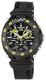 | A flurry of function for the adventurer at heart, the Tissot Men's T-Race Black Dial Watch has a lot to offer. This intrepid timepiece begins with a 44mm black-toned stainless steel case with a fixed bezel with yellow Arabic markers and a textured crown. These elements surround a complicated black dial, which is protected by a scratch-resistant crystal and features silver-toned index hour markers and silver-toned luminous hands powered by quartz movement. The dial also features three chronograph sub-dials offering 60-second, 30-minute and 1/10th-of-a-second displays and a date display window at the 4 'o clock position. A black rubber bracelet straps this watch to the wrist, while a push-button deployment clasp ensures its secure placement. Finally, this watch boasts water resistance up to 330 feet (100 meters). If you need your watch to be more than just stylish, then this is the watch for you. ...Read more |